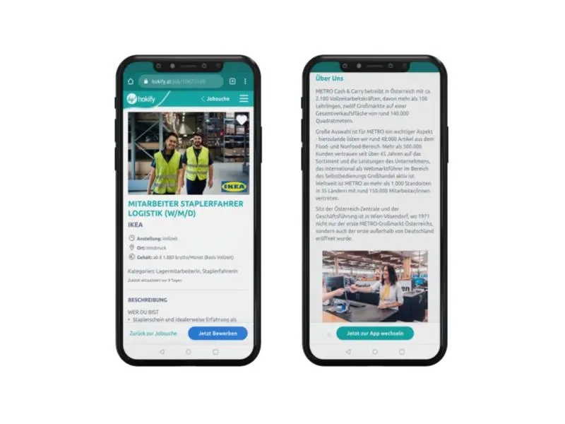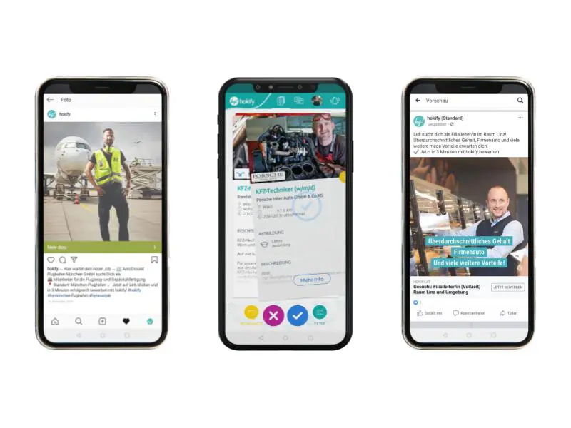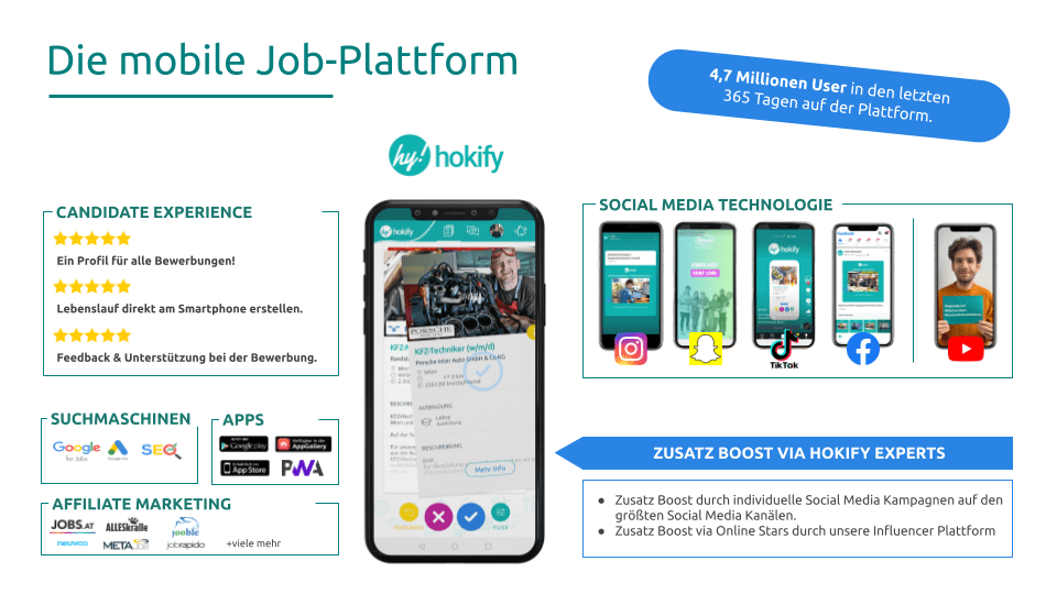 hokify is the mobile job platform and supports companies through innovative mobile & social media recruiting solutions to recruit new employees faster and easier. The core of the product is a mobile job platform that perfectly aligns the process from job search to application to the smartphone as well as a social media targeting algorithm to additionally address passive candidates on platforms like Facebook, Instagram or TikTok. hokify was used by 5 million job seekers last year and supports top companies like Porsche Inter Auto, McDonald’s or Randstad as well as more than 35,000 SMEs in recruiting.