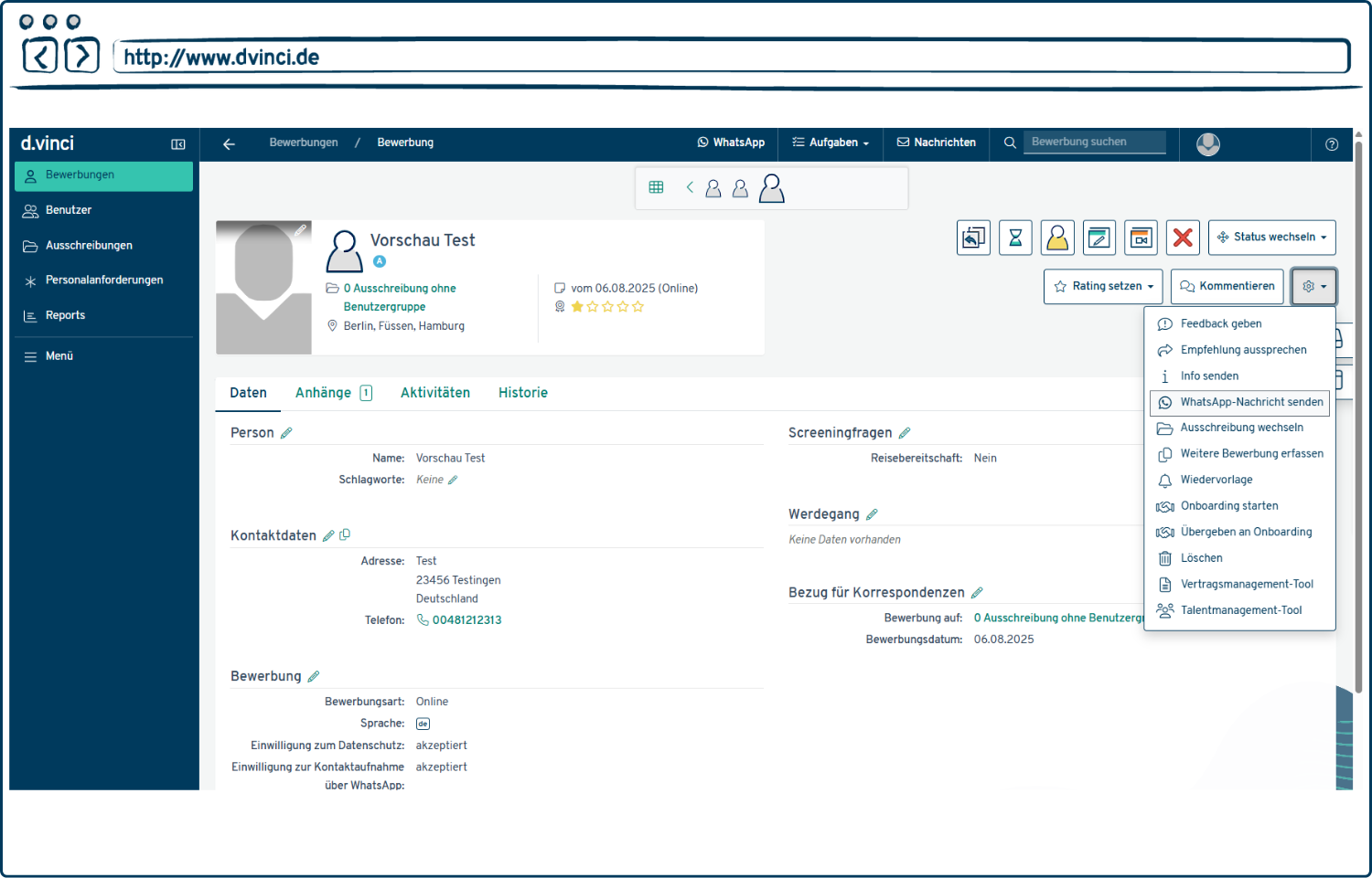 Für Recruiter:innen entsteht durch den integrierten WhatsApp 1:1 Chat ein nahtloser Kommunikationsfluss ohne Medienbrüche. Nachrichten werden direkt aus d.vinci gestartet, im System dokumentiert und zentral verwaltet – das spart Zeit, vermeidet Doppelaufwände und erhöht die Verbindlichkeit in der Abstimmung. Rückfragen, Terminvereinbarungen und finale Zusagen lassen sich deutlich schneller finalisieren, weil die Reaktionszeiten über WhatsApp erfahrungsgemäß niedrig sind. Gleichzeitig behält das Team die Übersicht: ungelesene Chats werden sichtbar, die Historie bleibt nachvollziehbar und Rechte lassen sich sauber steuern. So gewinnt das Recruiting an Tempo und Qualität – mit einer modernen, wertschätzenden Kommunikation, die die Candidate Experience stärkt und den Prozess effizienter macht.