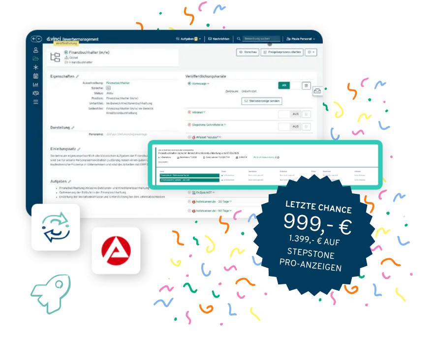 Erstelle Kampagnen direkt im d.vinci Bewerbermanagement und wähle aus über 1.000 Jobportalen, in denen du deine Stellenanzeigen mit einem Klick veröffentlichst.
