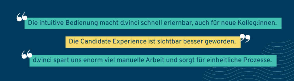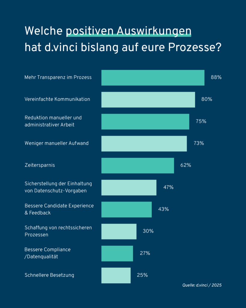 Was uns besonders gefreut hat: d.vinci hilft euch dabei spürbar – schnellere Prozesse, weniger manuelle Arbeit und mehr Transparenz tauchen in euren Antworten immer wieder auf. Genau dafür sind wir da.