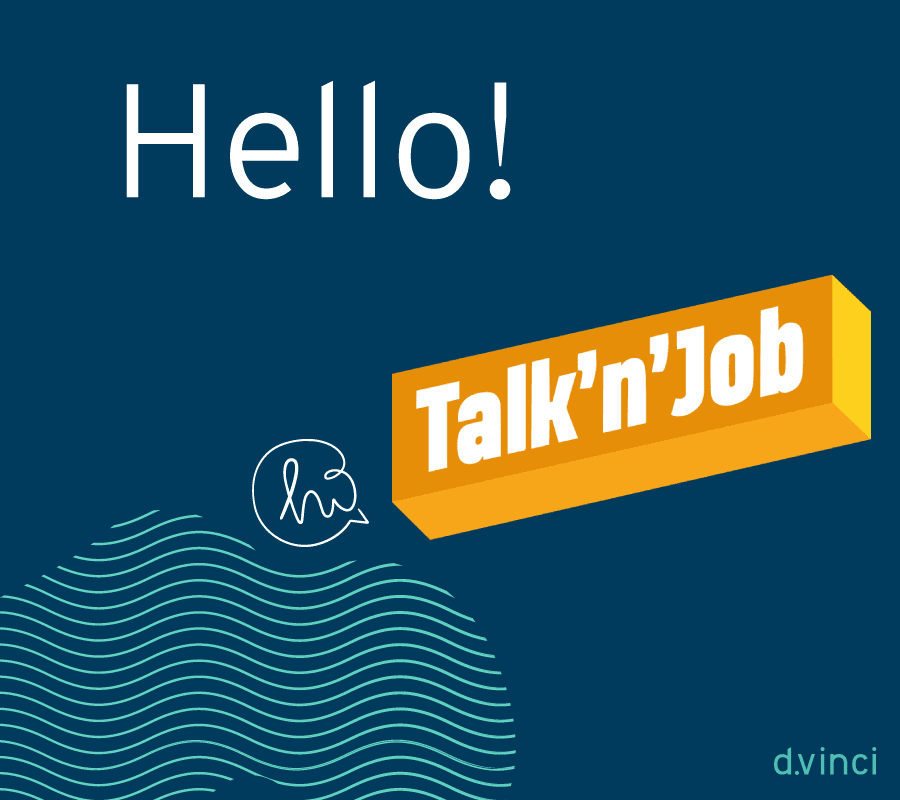 Hallo, toll, dass ich euch in diesem Format ein bisschen was über Talk’n’Job erzählen kann. Ich kümmere mich bei Talk’n’Job um die Kommunikation und bin dabei unter anderem mit tollen Partnern wie d.vinci im Austausch. Außerdem unterstütze ich unsere Firmenentwicklung im In – und Ausland und kann bei Live-Events, Messen, Konferenzen und anderen Formaten viele neue potentielle Partner, Kunden und Unterstützer kennenlernen.